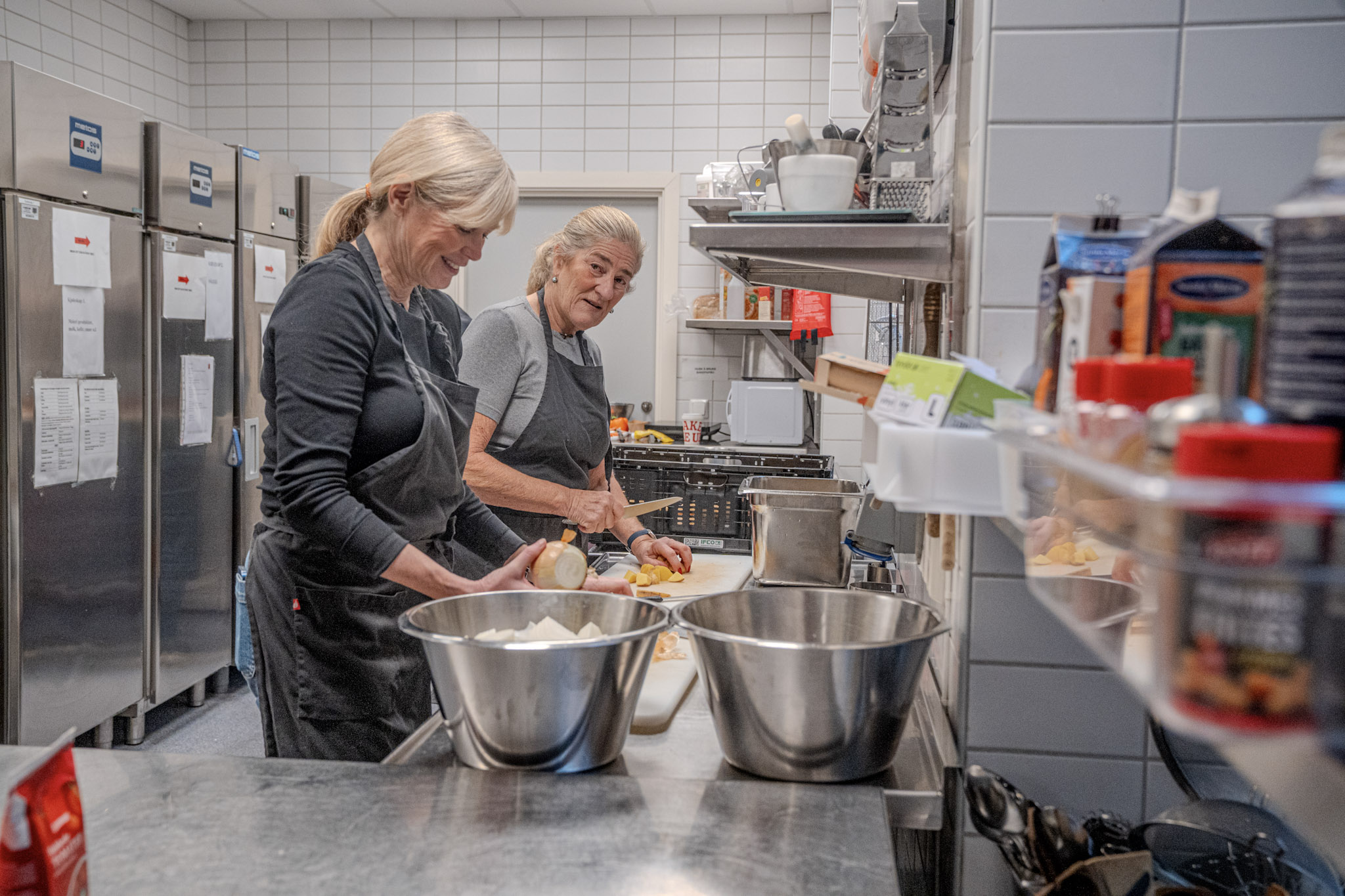 Med på laget er de to frivillige kokkene Birgitte og Cathrine. To damer med masse energi, kjærlighet og så mye sjarme at det fyller hele kjøkkenet.